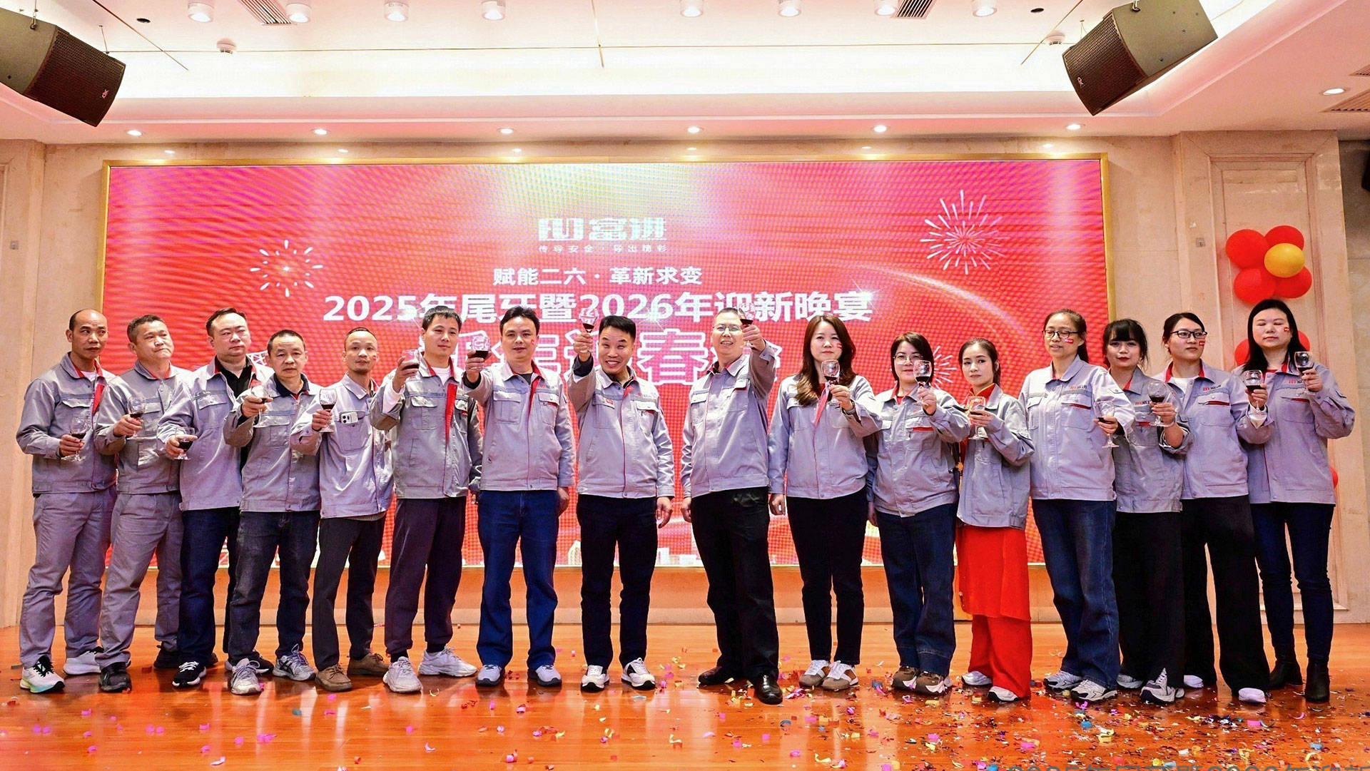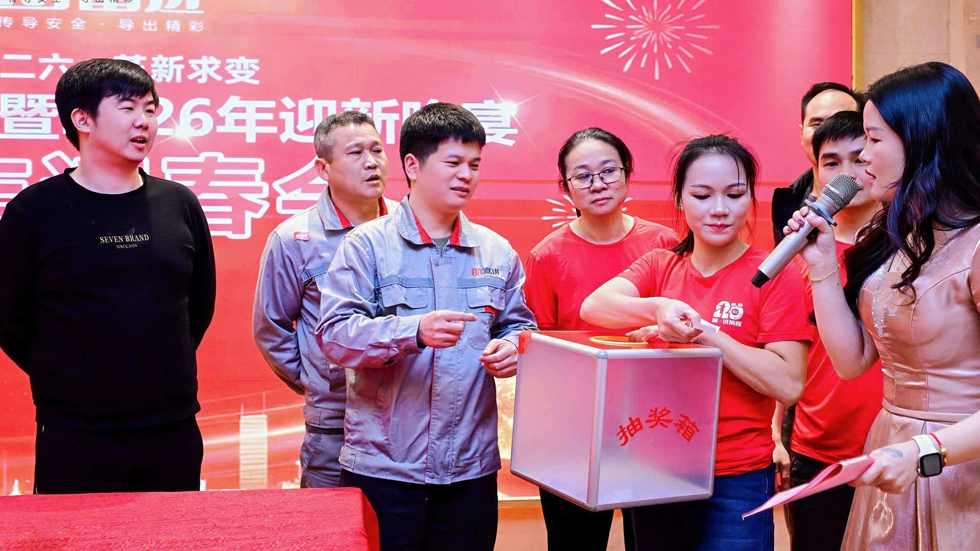 晚会伊始,吴总发表新年贺词,为公司发展锚定方向,点燃新征程的灯塔。管理层集体登台敬酒,将信任与温情融于杯中,致敬过往并肩作战的日夜,也为2026年许下"业绩翻番"的豪情壮志。